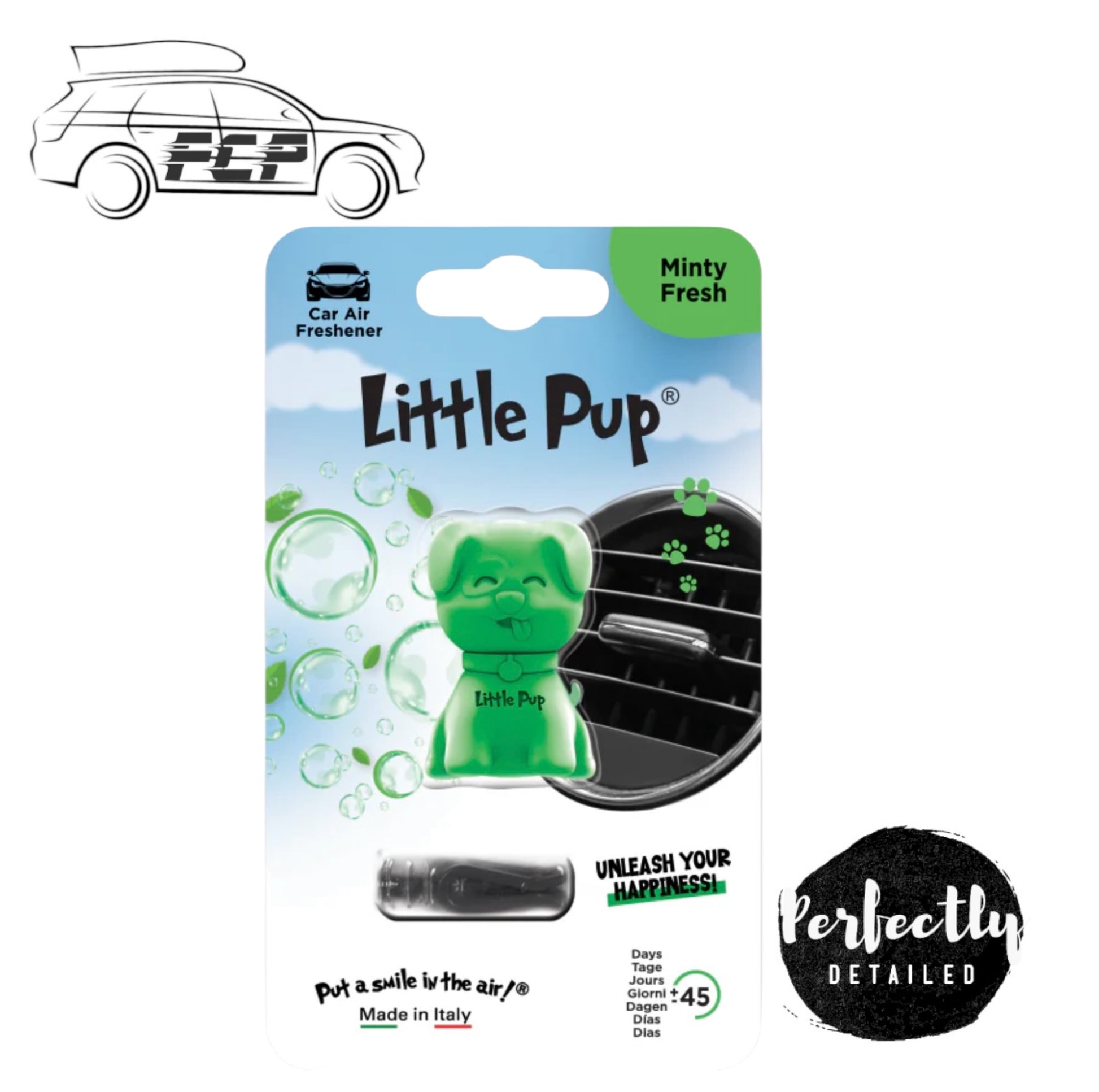 Designed with a vent clip attachment for easy install, Little Pup delivers a uniform fragrance release for long lasting freshness!